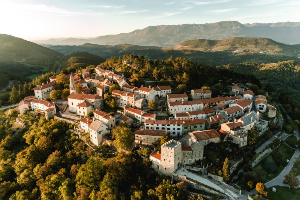 Slikovita kraška vas z gradom in značilno arhitekturo, idealna za sprehode in fotografiranje
